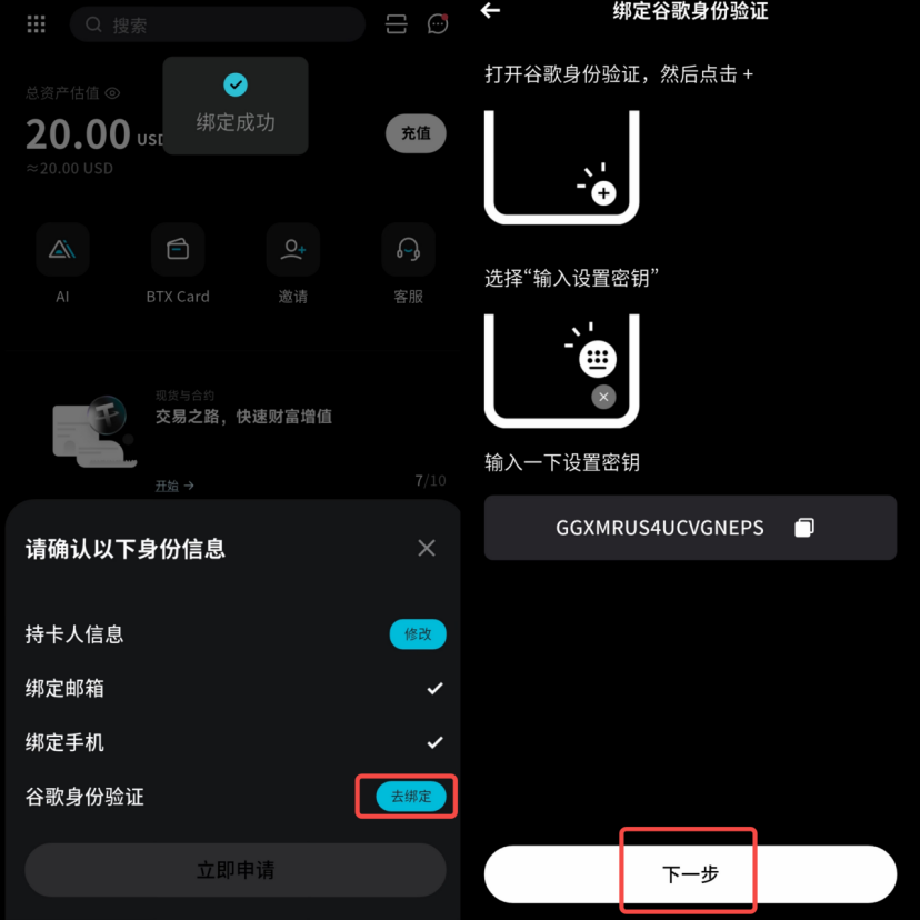 - 完成邮箱及手机号绑定后,您需要绑定谷歌验证码(如未安装,请先下载官方应用 "Google Authenticator")