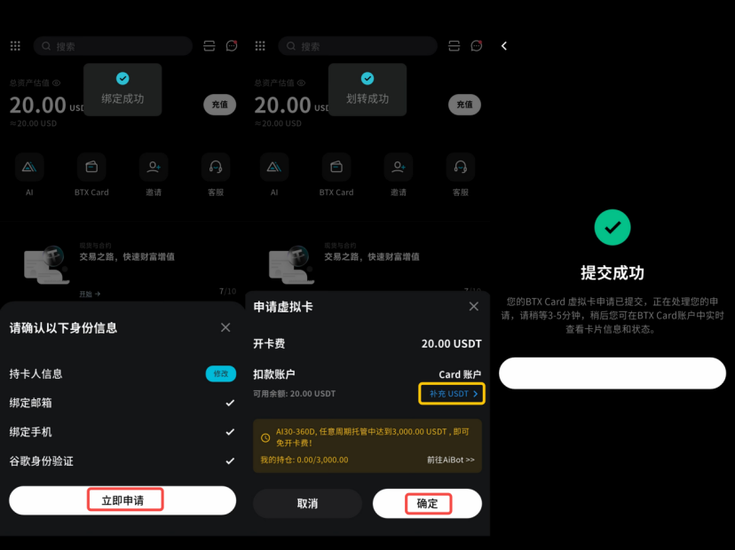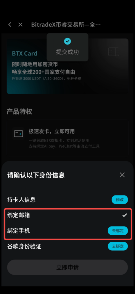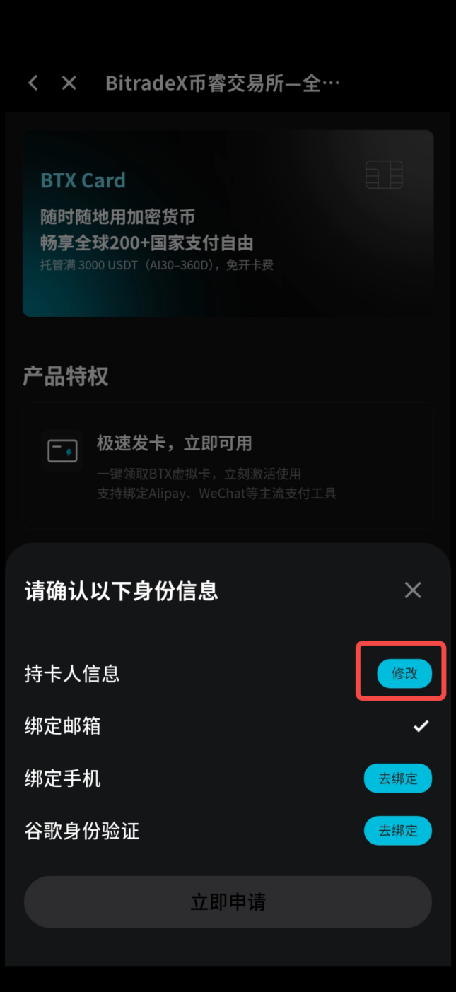 - 以上四个信息填写完毕后,返回 BTX Card 主页面,点击【立即申请】